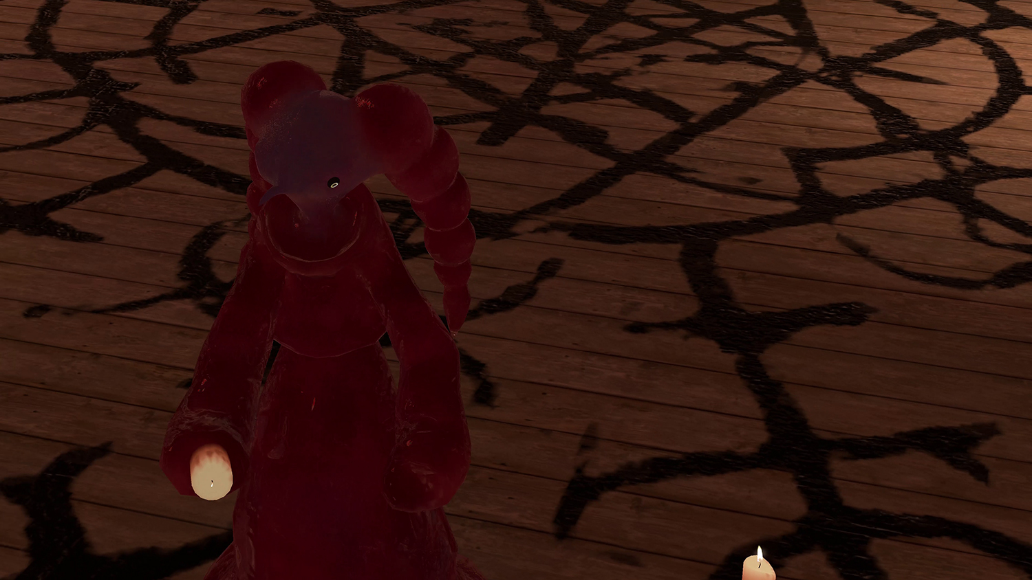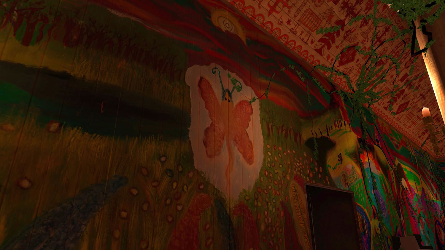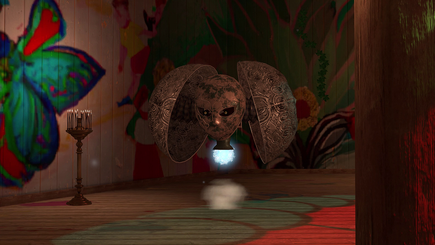 The shelter is comfortably warm and smells earthy and damp, and a little musky. In the candlelit space, strays of light gleam from the stained-glass oculus making the world seem to shimmer a little at its edges. Common ivy is climbing up the brittle, yet freshly painted, wooden walls of the edifice. In this realm, the virtual and the physical seems to be intimately entangled and you, the visitor, are merely a sigh here. Under these pointed arches, there is no time, but a feeling of eternity, allowing for a magnified awareness.