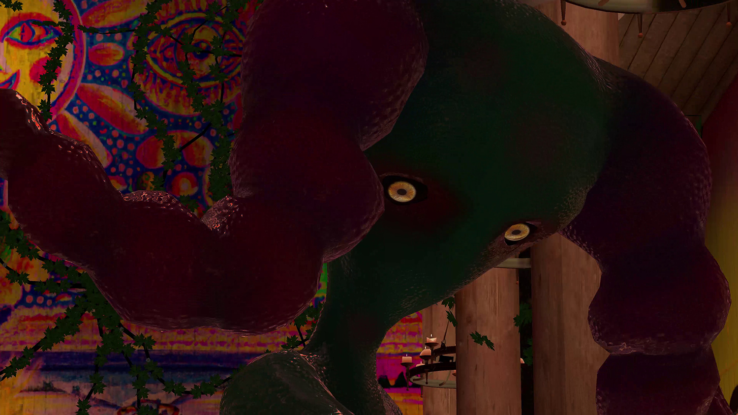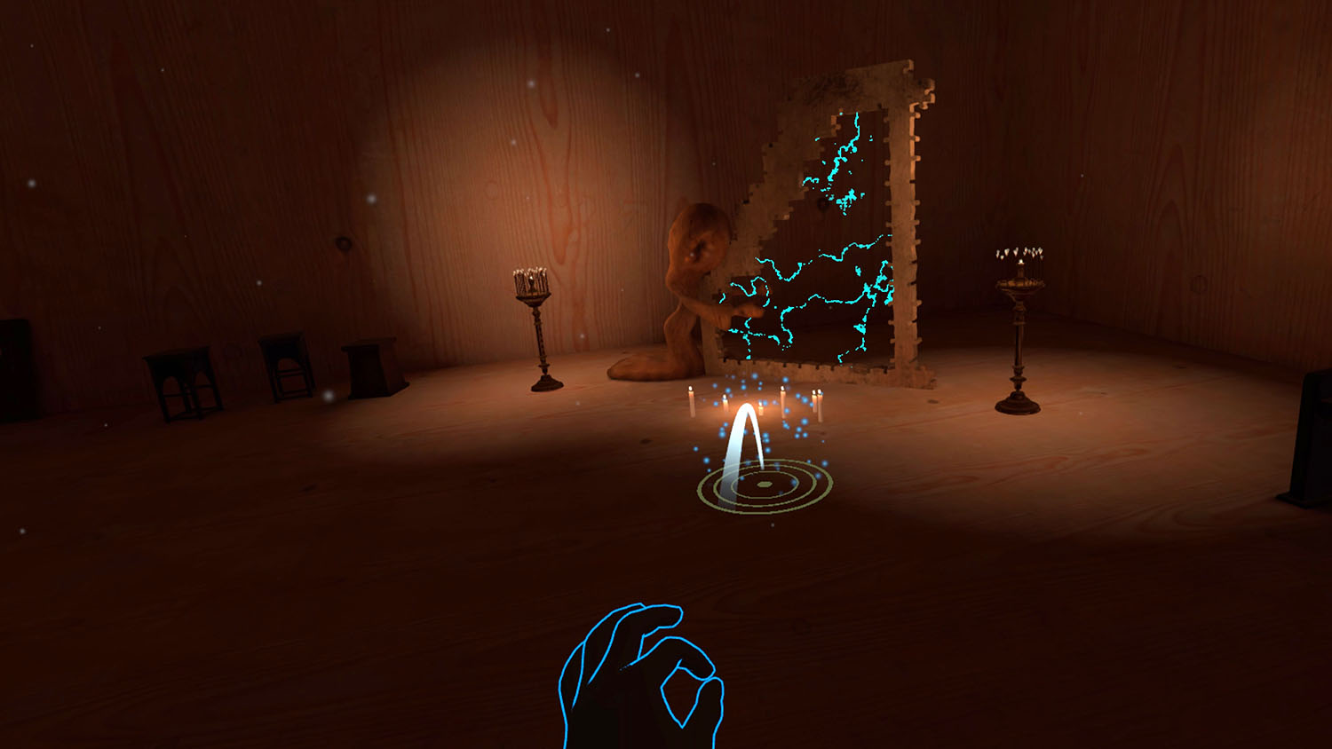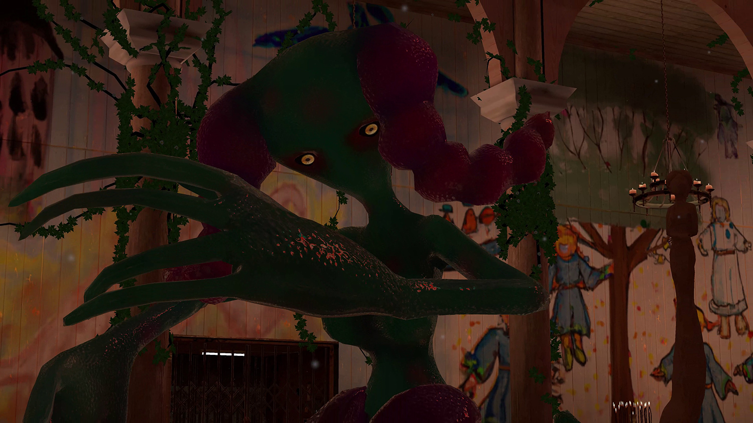 The shelter is comfortably warm and smells earthy and damp, and a little musky. In the candlelit space, strays of light gleam from the stained-glass oculus making the world seem to shimmer a little at its edges. Common ivy is climbing up the brittle, yet freshly painted, wooden walls of the edifice. In this realm, the virtual and the physical seems to be intimately entangled and you, the visitor, are merely a sigh here. Under these pointed arches, there is no time, but a feeling of eternity, allowing for a magnified awareness.