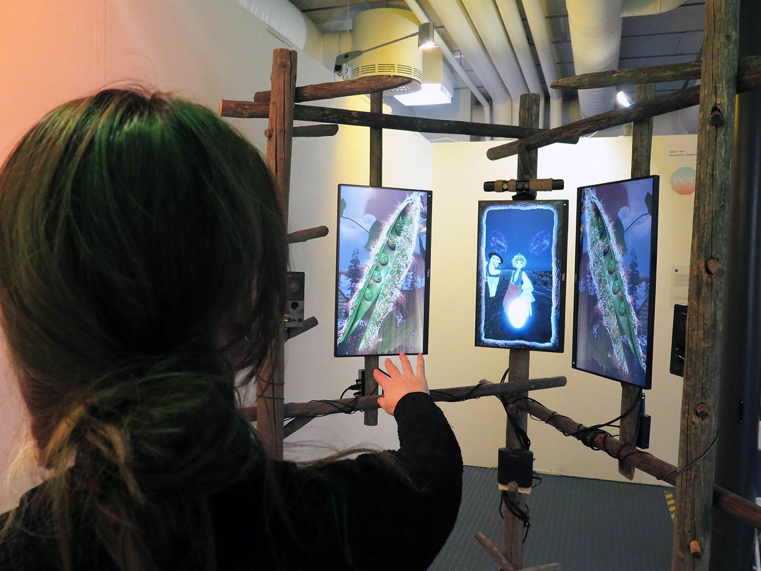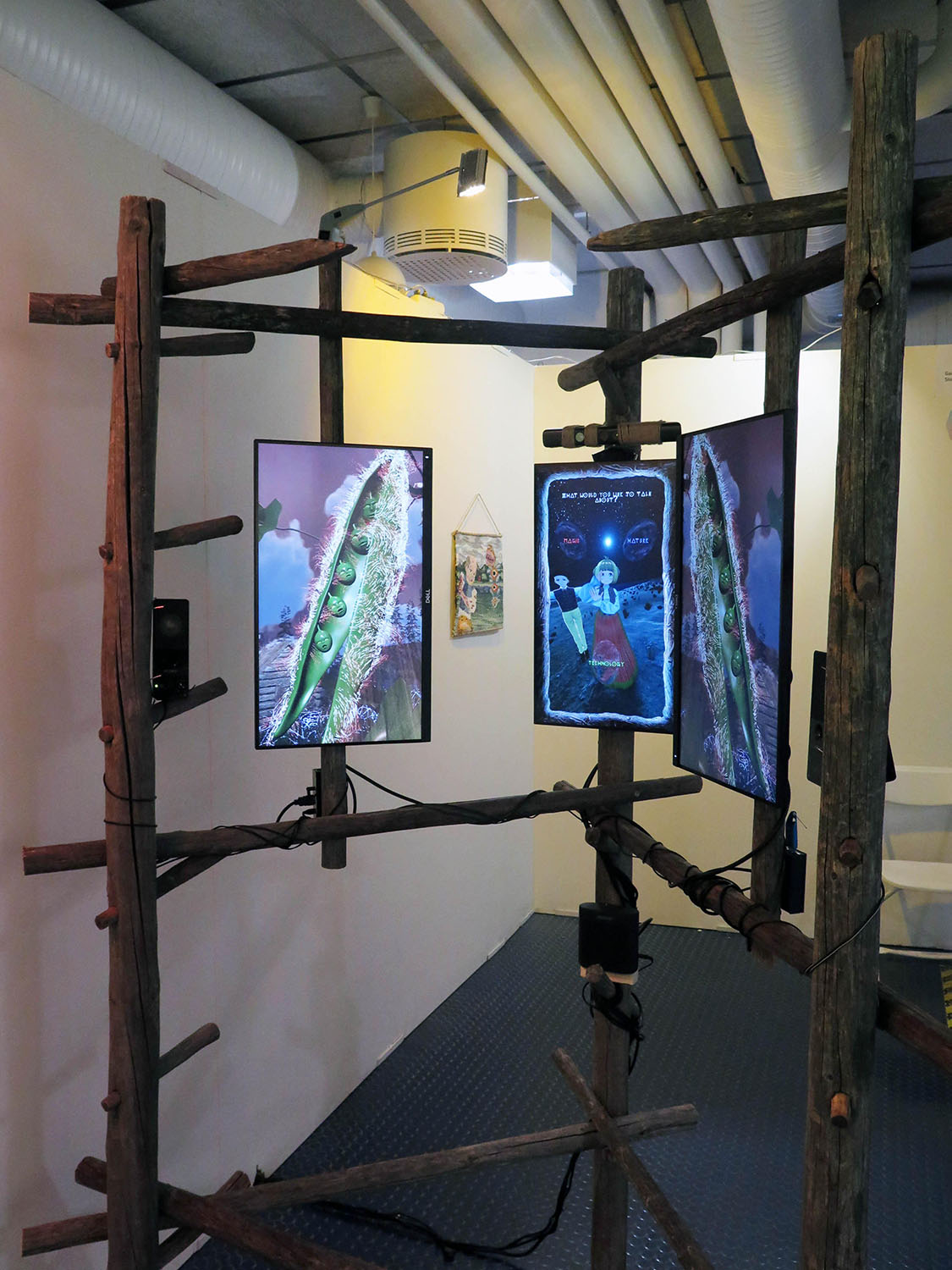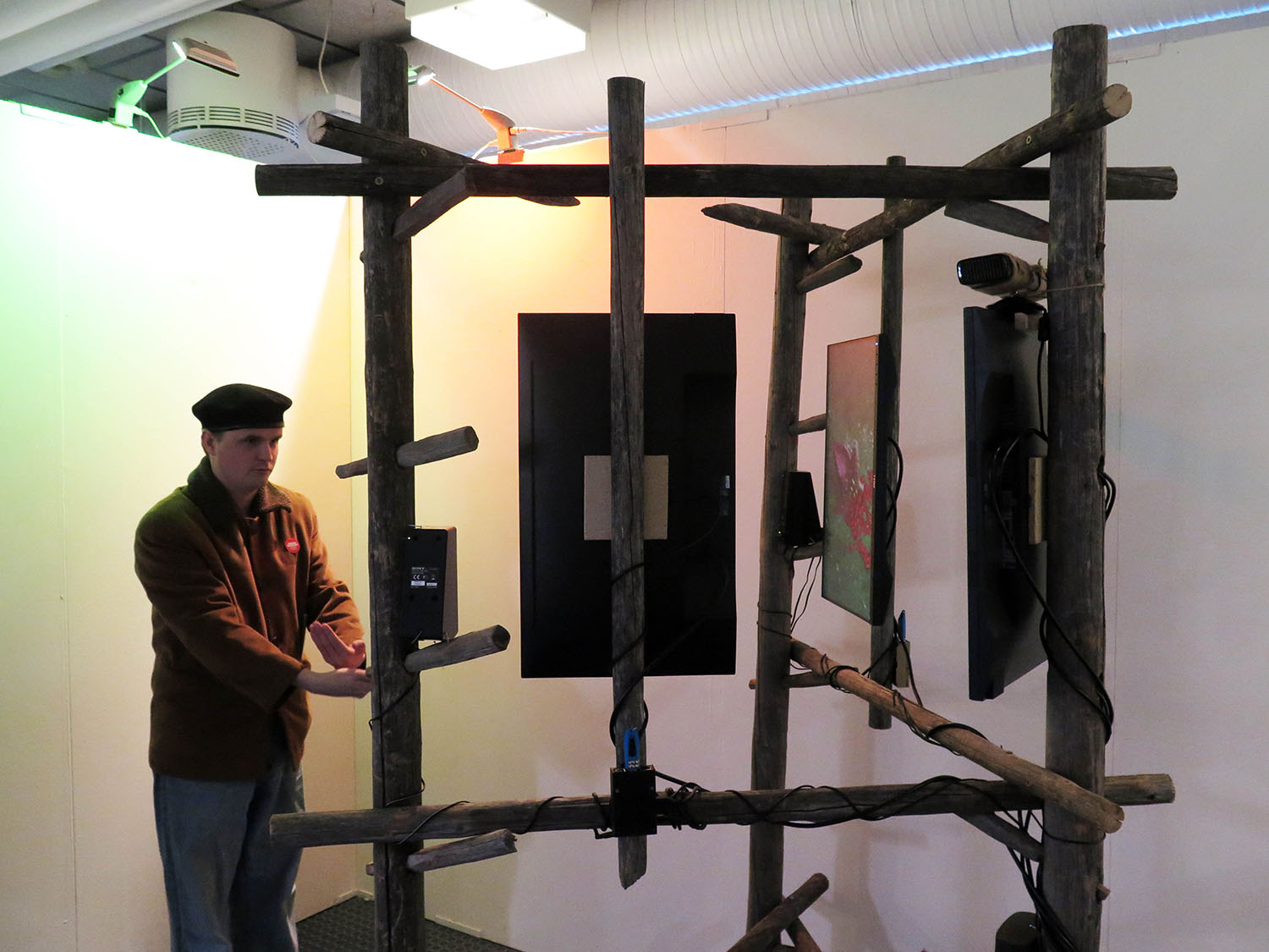3-channel interactive wood, video and audio installation.